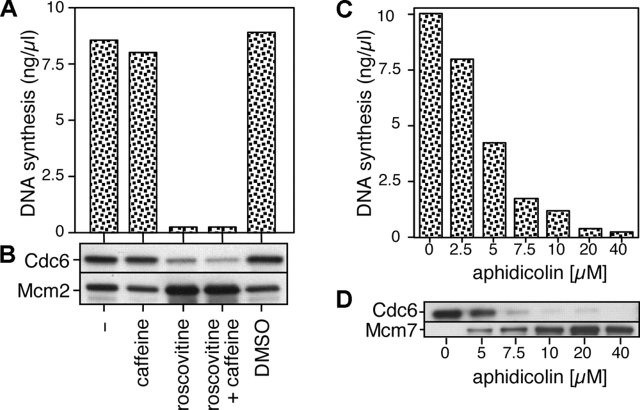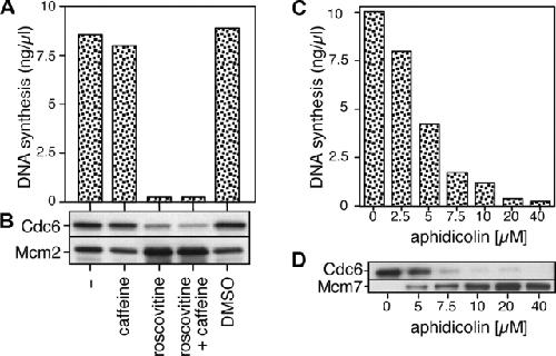 Figure 5. Cdc6 reloading onto chromatin is dependent on the initiation of replication. Sperm nuclei were incubated at 10 ng DNA/μl in interphase egg extract supplemented with combinations of 1 mM of roscovitine, 5 mM of caffeine, DMSO, or different concentrations of aphidicolin. After 90 min, samples were assayed for DNA synthesis (A and C) or chromatin was isolated and immunoblotted for Cdc6 and Mcm2 or Mcm7 (B and D).