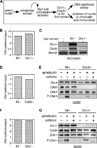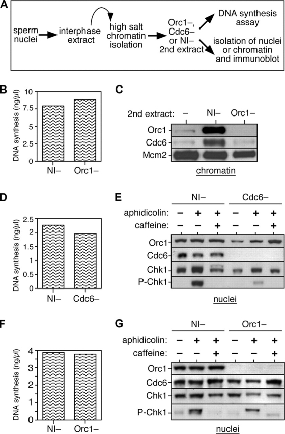 Figure 7. Cdc6 reloading is ORC dependent and Cdc6 is required in S phase for Chk1 activation. (A) Schematic of the experimental procedure. Sperm nuclei were incubated for 15 min at 15 ng DNA/μl in interphase egg extract. Chromatin was isolated under high salt conditions to remove ORC. Chromatin was incubated in a second extract depleted of either ORC or Cdc6 or mock depleted with nonimmune antibodies (NI−). DNA synthesis in the second extract (without aphidicolin or caffeine) was measured by incorporation of α-[32P]dATP (B, D, and F). The second extract was optionally supplemented with combinations of 40 μM aphidicolin or 5 mM of caffeine, and after 90 min in the second extract, chromatin, or intact nuclei were isolated and immunoblotted with the indicated antibodies (C, E, and G). (B and C) Licensed high salt-washed chromatin was incubated in Orc1- or nonimmune-depleted extracts. Chromatin was isolated and immunoblotted for Orc1, Cdc6, and Mcm2. (D and E) Licensed high salt-washed chromatin was incubated in Cdc6- or nonimmune-depleted extracts. Nuclei were isolated and immunoblotted for Orc1, Cdc6, Chk1, and phospho-Chk1. (F and G) Licensed high salt-washed chromatin was incubated in Orc1- or nonimmune-depleted extracts. Nuclei were isolated and immunoblotted for Orc1, Cdc6, Chk1, and phospho-Chk1.