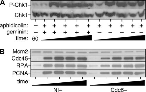Figure 8. The checkpoint function of Cdc6 does not depend on Mcm2-7 loading. (A) Sperm nuclei were incubated in extract supplemented with 40 μM aphidicolin. At 15 min, after licensing had occurred, recombinant gemininDEL was added to an aliquot of the reaction. At 30, 60, 90, 120, and 150 min from the start of the incubation, nuclei were isolated and immunoblotted for Chk1 and phospho-Chk1. Nuclei isolated at 60 min from extract lacking aphidicolin is also shown as control. (B) Sperm nuclei were incubated for 15 min at 15 ng DNA/μl in interphase egg extract. Chromatin was isolated under high salt conditions to remove ORC. Chromatin was then incubated in a second extract depleted of Cdc6 or mock depleted with nonimmune antibodies (NI−). Both extracts were supplemented with 40 μM aphidicolin. At 0, 1, 2, 3, or 4 h afterwards, chromatin was isolated and immunoblotted for Mcm2, Cdc45, RPA-70, or PCNA.