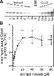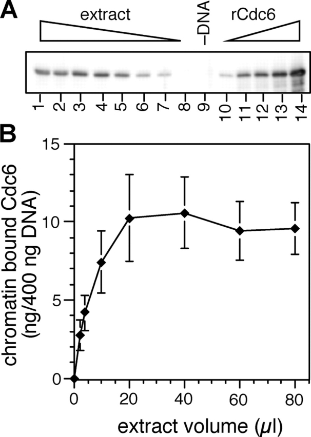Figure 2. Unlicensed chromatin becomes saturated with approximately two copies of Cdc6 every 10 kb. 400 ng of aliquots of sperm nuclei were incubated for 30 min in increasing volumes of interphase extract supplemented with gemininDEL. (A) Chromatin was isolated and immunoblotted for Cdc6. Lanes 1–8 represent chromatin incubated in 80, 60, 40, 20, 10, 4, 2, and 1 μl extract. Lane 9 shows a mock chromatin isolation from 20 μl extract containing no DNA. Lanes 10–14 show loading standards, containing 5, 10, 15, 20, and 25 ng recombinant Cdc6. (B) The quantity of chromatin-bound Cdc6 was estimated from gels as shown in A. The mean and SD of three separate experiments is shown.