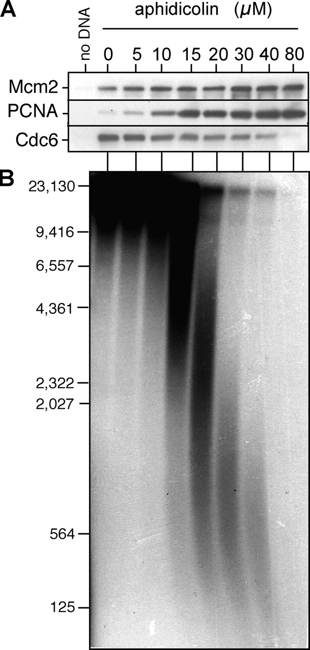 Figure 6. Cdc6 reloading requires fork elongation. Sperm nuclei were incubated at 10 ng DNA/μl in interphase egg extract treated with 0–80 μM aphidicolin in the presence of 5 mM of caffeine and α-[32P]dATP. (A) At 90 min, chromatin was isolated and immunoblotted for Mcm2, PCNA, and Cdc6. (B) DNA was separated on an alkaline agarose gel and autoradiographed. The migration of molecular weight markers (in bp) is shown on the left.