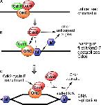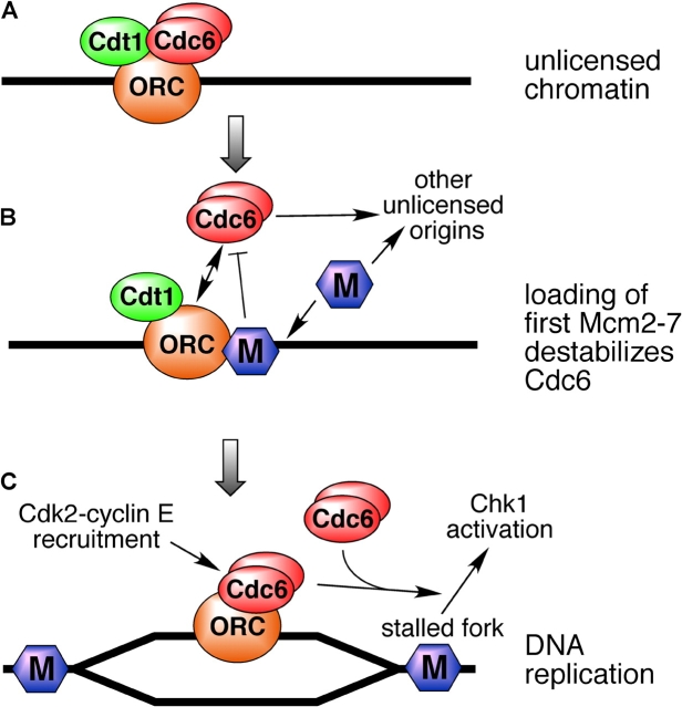 Figure 9. A model for Cdc6 function. (A) Dimers of Cdc6 bind tightly to unlicensed chromatin. (B) Although 10–20 copies of Mcm2-7 are normally loaded onto each origin, loading of the first one to two copies of Mcm2-7 (M) is sufficient to minimally license the origin. Once this has happened, the affinity of Cdc6 for the origin declines. This potentially directs Cdc6 and Mcm2-7 to other unlicensed origins. (C) Once replication forks have initiated and moved a small distance from the origin, Cdc6 can rebind to ORC at the origin with high affinity. This permits recruitment of cyclin E to the origin. Cdc6 is also required during S phase to allow Chk1 activation in response to replication fork inhibition, though ORC-dependent chromatin binding is not required for this function.