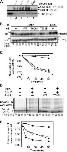 Figure 2. Thr 605 in BubR1 is required for spindle checkpoint arrest. (A) CSF extracts were mock depleted (lane 5) or depleted (lanes 1–4) of BubR1. Recombinant GST-tagged BubR1 (lane 2), BubR1-T605A (lane 3), or BubR1-T605E (lane 4) was added to the depleted extracts. Different amounts of extracts were loaded to determine the depletion efficiency. (B and C) CSF extracts that had undergone immunodepletion and addback of the indicated proteins were incubated with sperm chromosomes and nocodazole to activate the spindle checkpoint, followed by incubation with (top) or without (bottom) calcium. At the indicated times, an aliquot of extracts was assayed for the Cdk1 kinase activity using histone H1 as a substrate. The kinase activity was quantified and plotted (C) upon normalization to the value at time 0 for the corresponding samples. C shows mock-depleted extracts (star), BubR1-depleted extracts (square), BubR1-depleted extracts with addback of GST-BubR1 (filled circle), GST-BubR1-T605A (open circle), and GST-BubR1-T605E (triangle). (D and E) Inhibition of APC-Cdc20–mediated ubiquitination by equal amounts of recombinant GST-BubR1 and GST-BubR1-T605A was assayed using in vitro translated 35S-securin substrate, as described previously (Fang, 2002). The amount of securin remaining was quantified and plotted (E) upon normalization to the value at time 0 for the corresponding samples. E shows interphase APC (iAPC; square), iAPC + Cdc20 (filled circle), iAPC + Cdc20 + BubR1 (triangle), and iAPC + Cdc20 + BubR1-T605A (open circle).