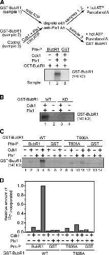 Figure 4. Activation of the BubR1 kinase by Plx1 and Cdk1 is dependent on Thr 605. (A) BubR1 autophosphorylation was assayed as diagramed. Recombinant GST-BubR1 was prephosphorylated (Pre-P) in 0.2 mM of unlabeled ATP in the presence (sample 2) or absence (sample 1) of Plx1 and Cdk1/cyclin B. Plx1 was then removed by anti-Plx1 antibody beads, and prephosphorylated BubR1 was assayed for its autophosphorylation activity in the presence of γ-[32P]ATP and purvalanol A. In a parallel control (sample 3), recombinant GST, not BubR1, was used in the prephosphorylation reaction, and thereafter an aliquot of unphosphorylated GST-BubR1 protein was added before the autophosphorylation reaction. (B) 550 ng each of wild-type BubR1 and kinase-dead mutant was assayed for autophosphorylation after being prephosphorylated by Cdk1 and Plx1 as described in A. (C and D) 550 ng each of recombinant GST-BubR1 (lanes 1–4), GST-BubR1-T605A (lanes 8–11), and GST (lanes 5–7 and 12–14) was prephosphorylated by either Cdk1/cyclin B (lanes 2, 5, 9, and 12) or Plx1 (lanes 3, 6, 10, and 13), or by both kinases (lanes 4, 7, 11, and 14). The autophosphorylation assay was then performed as described in A. In control GST samples (lanes 5–7 and 12–14), unphosphorylated BubR1 (lanes 5–7) or BubR1-T605A (lanes 12–14) were added after the prephosphorylation step but before the autophosphorylation reaction. The extent of autophosphorylation was quantified by measuring the amount of 32P incorporated in BubR1 (D).