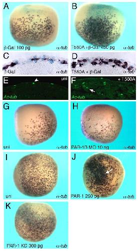 Fig. 3. PAR1 promotes ciliated cell differentiation. Four- to eight-cell embryos were unilaterally injected with lacZ RNA (light blue staining) or PAR1 RNAs or MO as indicated and subjected to in situ hybridization for α-tubulin expression at stages 13-14. (A-D) T560A increases the number of α-tubulin-expressing cells in epidermal ectoderm. (C,D) Cross-sections of embryos shown in A,B. A single layer ofα -tubulin-positive cells in control ectoderm (C) expanded to a double layer of positive cells in T560A-expressing ectoderm (D, arrowhead). (E,F) Enhanced cilia differentiation in T560A RNA-injected embryos at stage 18 (F), when compared with uninjected controls (E), revealed by immunostaining for acetylated tubulin. Arrowhead in E demarcates ciliated cells that migrated to the surface. Arrow in F indicates ectopic ciliated cells remaining in the inner ectoderm layer. (G,H) PAR1B MO decreases the number of α-tubulin-expressing cells (H) as compared with the uninjected side (G). (I) Uninjected embryo; (J) PAR1 RNA increases ciliated cell number (white arrow); (K) PAR1 KD RNA has no significant effect on ciliated cells. Lateral view is shown in all panels, except I-K (ventral view).