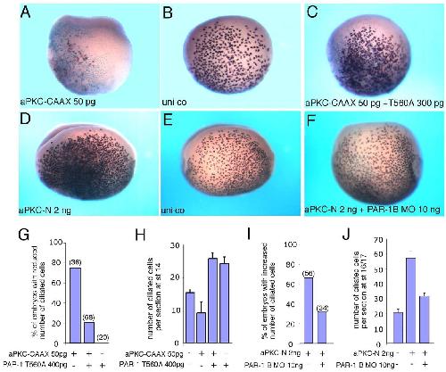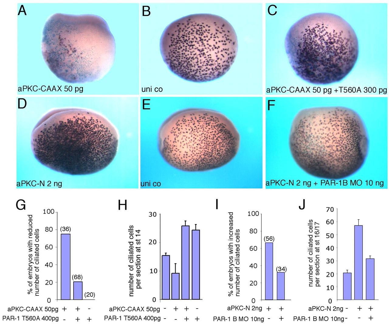 Fig. 5. aPKC functions upstream of PAR1 to specify ectodermal cell fates. Embryos were injected with RNAs or MO as described in Fig. 1. Ciliated cells were detected at stages 14-16 by in situ hybridization with the α-tubulin probe. (A-C) T560A reverses the inhibitory effect of aPKC-CAAX on ciliated cell differentiation. Two sides of the same embryo are shown in B and C. (D-F) PAR1B MO (F) suppresses aPKC-N-mediated expansion of ciliated cells. The injected and uninjected sides of the same embryo are shown in D and E, respectively. (G-J) Quantification of the data shown in A-C (G,H) and D-F (I,J). Numbers of embryos per group are shown above bars. (G,I) Frequencies of embryos showing visible phenotypic changes. (H,J) Mean numbers of α-tubulin-positive cells per section±s.d. are shown. Sections of at least three representative embryos per group were analyzed.