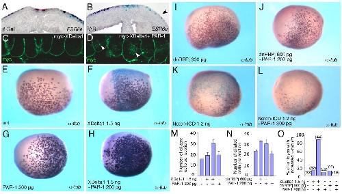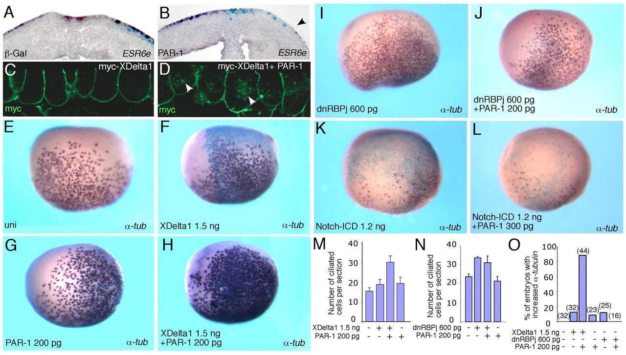 Fig. 8 . PAR1 synergizes with XDelta-1 to induce ciliated cell differentiation and inhibits the Notch target ESR6e. Four- to eight-cell embryos were unilaterally injected with the indicated RNAs and lacZ RNA as a lineage tracer (light blue staining) and subjected to in situ hybridization with the ESR6e (A,B) or -tubulin (E-L) probes. (A,B) Superficial staining for ESR6e is unaffected in cross-sections of lacZ RNA-injected control embryos (A, 100 pg), but is inhibited in PAR1 RNA-injected embryos (B, right side, arrowhead, 250 pg). (C) Basolateral localization of XDelta-1 in Xenopus ectoderm. (D) XDelta-1 is detected in multiple cytoplasmic vesicles (arrowheads) in the presence of PAR1. (E) Uninjected embryo. (F,G) XDelta-1 RNA alone (F) or low dose of PAR1 RNA (G) do not significantly alter the number of ciliated cells. (H) The synergistic effect of coinjected PAR1 and XDelta-1 RNAs on ciliated cell development. (I,J) PAR1 does not influence the activity of a dominant intracellular inhibitor of the Notch pathway, dnRBP/j, which can stimulate ciliated cell development. (K) Notch-ICD suppresses ciliated cell differentiation. (L) PAR1 does not alter Notch-ICD activity. (M-O) Quantification of the effects shown in E-J, presented as numbers of ciliated cells per section (M,N) and frequency of embryos with increased -tubulin staining (O). Numbers of examined embryos are shown above bars. The data are representative of three independent experiments.