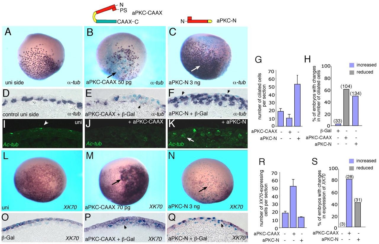 Fig. 1. A role of aPKC in epidermal ectoderm development. Four- to eight-cell embryos were unilaterally coinjected with aPKC-CAAX or aPKC-N RNAs and lacZ RNA as a lineage tracer (light blue staining). Injected embryos were cultured until stages 14-16, fixed and subjected to whole mount in situ hybridization with anti-sense probes to α-tubulin (A-H) and XK70 (L-S). aPKC constructs employed are shown above panels B and C. (A-K) Changes in ciliated cell differentiation. aPKC-CAAX decreases (B,E), whereas aPKC-N increases (C,F) ciliated cell differentiation (arrows) on the injected side as compared with the uninjected side (A,D). The same embryo is shown in A and B. (D-F) Sections corresponding to embryos in A-C. (D) A single row of α-tubulin-positive cells in the deep layer of uninjected ectoderm. (F) α-Tubulin-positive cells are found in the superficial layer (arrows). (G) Quantification of the results showing mean numbers of α-tubulin-positive cells per section±s.d. Sections of at least three representative embryos per group were analyzed. (H) Frequency of embryos with altered numbers of ciliated cells (data pooled from several experiments). Embryos were scored positive if the number of ciliated cells per injected area was increased by at least 50%. The data are representative of three independent experiments. (I-K) Cilia differentiation assessed by immunostaining with antibodies to acetylated tubulin in stage 18 embryos. (I) Uninjected control embryos with regular pattern of superficially located ciliated cells, (J) aPKC-CAAX injection inhibits cilia formation, (K) aPKC-N injection results in multiple cells with many differentiated cilia. (L-S) aPKC promotes superficial cell fate. (L,O) Control XK70 staining. (M,P) aPKC-CAAX expands XK70 (arrow) on the injected side. (N,Q) aPKC-N downregulates XK70 (arrow). (O-Q) Sections corresponding to embryos in L-N. Superficial expression of XK70 (O) is extended into the deep cell layer in aPKC-CAAX RNA-injected embryos (P, arrowhead). (Q) Inhibition of XK70 by aPKC-N (arrowhead). In all panels, arrows indicate altered staining as a result of injection. (R,S) Quantification of the effects, shown as average numbers of XK70-expressing cells in affected embryos (R), and frequency of embryos with visible changes in XK70 expression (S). Numbers of embryos per group are given above the bars. The data are from three representative experiments.