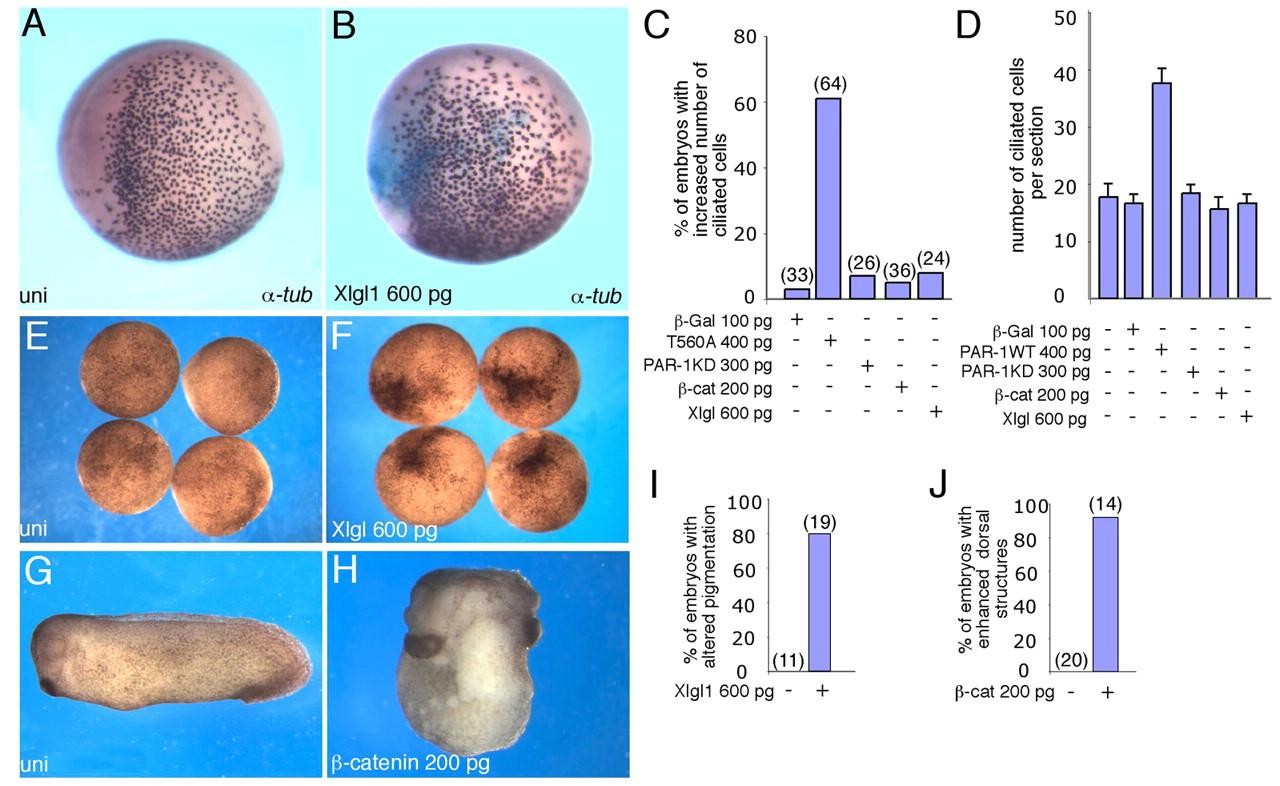 Fig. 4. Lack of effect of β-catenin and LGL on ciliated cell development. In situ hybridization with α-tubulin probe is shown. For experimental details, see Fig. 1 legend. (A) Uninjected embryo. (B) LGL1 (Xlgl1) RNA has no effect on α-tubulin-expressing cells. (C,D) Quantification of the effects of T560A, PAR1, PAR1-KD, β-catenin and LGL1 RNAs on ciliated cell development, presented as frequencies of affected embryos (C) and numbers of ciliated cells per section (D). In C, numbers of embryos per group are shown above bars. Data are representative of four different experiments. (E,F,I) LGL1 RNA, used in B, altered ectoderm pigmentation in 79% of injected embryos (n=19; F) as compared with uninjected controls (E). (I) Quantification of the results in E and F. (G,H,J) Marginal zone-injected β-catenin RNA dorsalized 92% of injected embryos (n=14), characterized by enlarged head and cement gland and truncated or missing tail (H), as compared with uninjected siblings (G). (J) Quantification of the results in G,H.