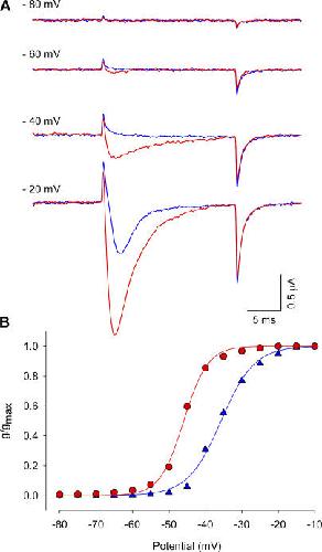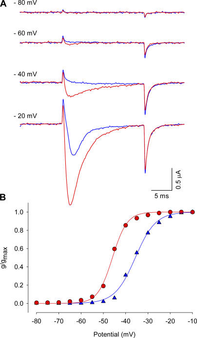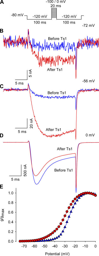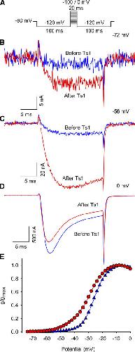 Figure 1. Effect of Ts1 in the sodium currents activation. (A) Voltage protocol used to record the inward sodium currents. (B) Superimposed sodium currents obtained at −72 mV before (blue trace) and after (red trace) the treatment with 50 nM of Ts1. (C) Superimposed sodium currents obtained at −56 mV before (blue trace) and after (red trace) the treatment with Ts1 (50 nM). (D) Superimposed sodium currents obtained at 0 mV before (blue trace) and after (red trace) the treatment with Ts1 (50 nM). (E) Superimposed G-V curves obtained before (blue symbols) and after (red symbols) the treatment with Ts1 (25 nM).