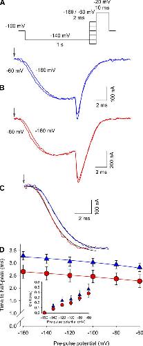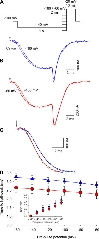 Figure 2. Effect of Ts1 in the Cole-Moore shift. (A) Voltage protocol used to measure the Cole-Moore shift. (B, top) Superimposed sodium currents obtained in the absence of Ts1, following a prepulse to −60 mV (lefthand trace) or −160 (righthand trace). (B, bottom) Superimposed sodium currents obtained in the presence of Ts1 (100 nM), elicited as described above for the control conditions. (C) Superimposed sodium currents (prepulses to −160 mV) recorded in control conditions (blue line) and in the presence of Ts1 (red line). Black lines are the fits to the function in Eq. 1 (see Materials and Methods). Arrows in A and B indicate the beginning of the pulse. (D) Time to the half-maximal sodium current for indicated potentials in control conditions (blue triangles) and in the presence of Ts1 (red circles). The inset shows the time shift necessary to superimpose the currents for the indicated potentials with respect to the currents at −160 mV (control, blue triangles; in presence of Ts1, red circles). Blue and red lines are the fits to the function shown in Eq. 2. The parameters obtained for the curve in the absence of Ts1 were z = 2.3; Vh = 0 mV; the parameters obtained in the presence of Ts1 were z = 4.4; Vh = −17.7 mV.
