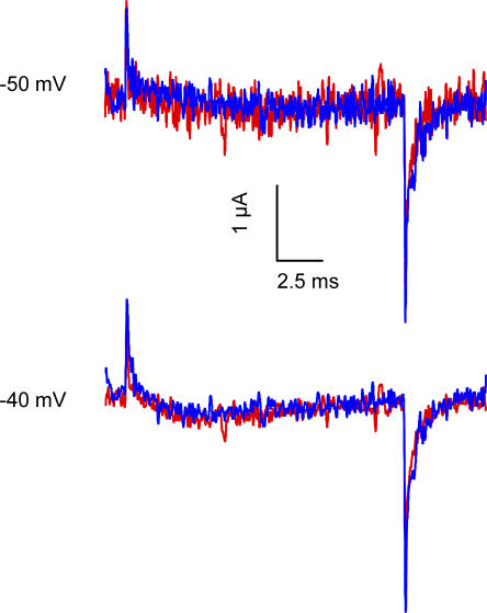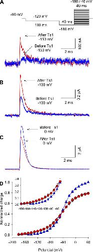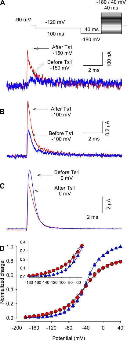 Figure 3. Effect of Ts1 on gating currents. Superimposed gating current traces elicited by a test pulse to −150 mV (A), −100 mV (B), and 0 mV (C) in control conditions (blue line) and in the presence of 50 nM Ts1 (red line). (A, inset) Voltage protocol used to record the currents. (D) Charge–voltage (Q-V) relationships (normalized to the maximum charge in control conditions) in the presence of Ts1 (red circles) and in control conditions (blue triangles). Solid and dashed traces are the fits to the function in Eqs. 3 and 4, respectively (see Materials and Methods). See Table I for fitted parameters.