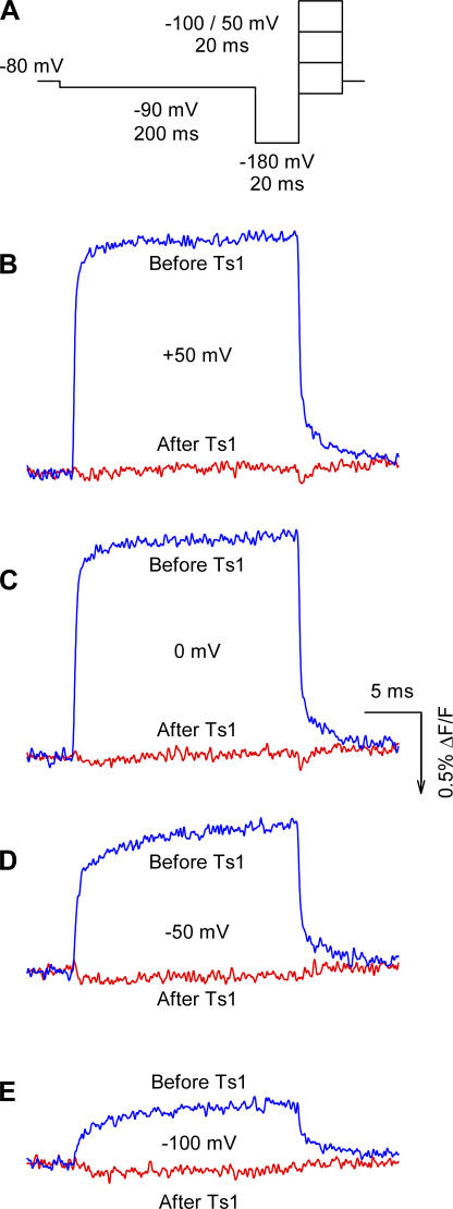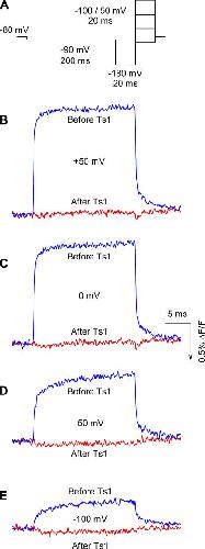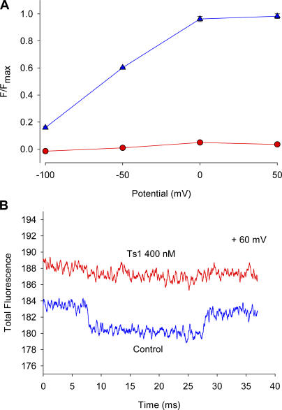 Figure 6. Effect of Ts1 on S4-DII movement. (A) Voltage protocol used to measure the fluorescence signals. Superimposed fluorescence traces recorded at +50 mV (C), 0 mV (D), −50 mV (E), and −100 mV (F) in control conditions (blue lines) and in the presence of Ts1 (0.5 μM, red lines). The fluorescence increases in the same direction of the arrow in the scale bar.
