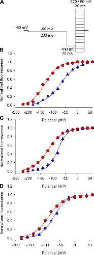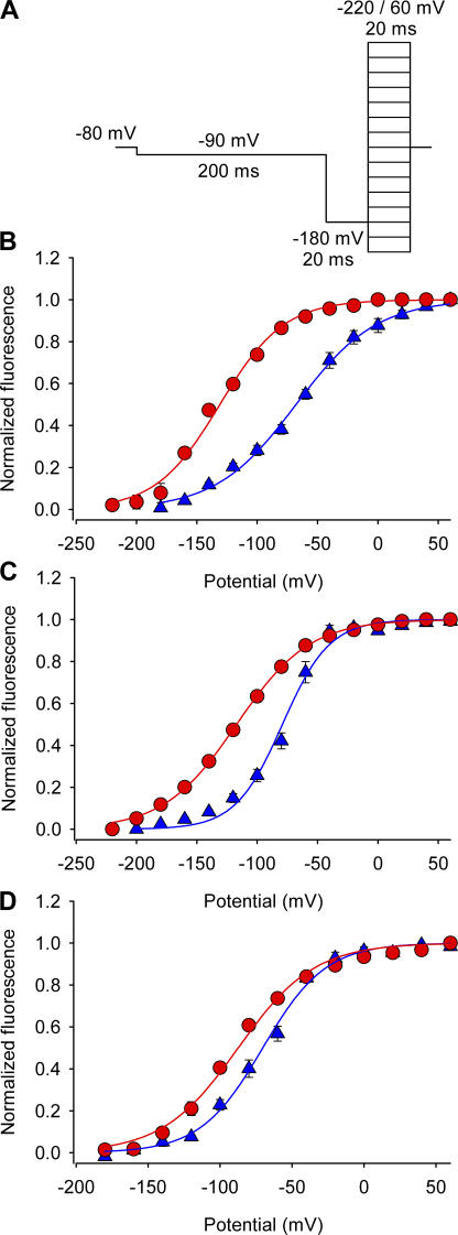 Figure 8. Effect of Ts1 on S4-DI, S4-DIII, and S4-DIV movements. (A) Voltage protocol used to measure the fluorescence signals. (B–D) F-V relationships for domains I (S216C) (B), III (L1115C) (C), and IV (S1436C) (D) in absence (blue triangles) and presence of Ts1 (50 nM, red circles). Solid lines are the fits to the function in Eq. 5 (see Materials and Methods). See Table II for fitted parameters.