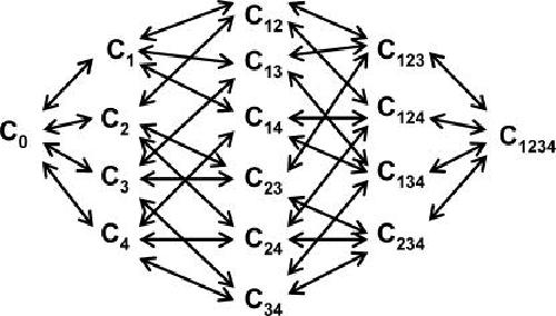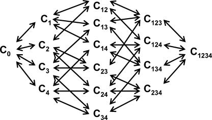Figure 9. A general kinetic model for gating in a voltage-gated ion channel. C0 corresponds to the fully deactivated state, with all four S4 segments in the resting position. C1, C2, C3, and C4 correspond to the states where voltage sensors from domains I, II, III, and IV are activated. The numbers in the index refers to voltage sensors that are in activated position. C1234 corresponds to the fully activated state and the open channel form, with all the S4 segments in the activated position.