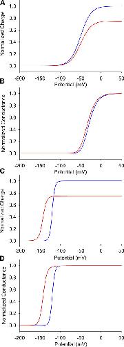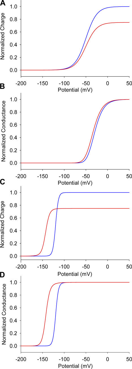 Figure 10. Modulation of gating in independent and allosteric models. Simulations of the charge–voltage (A) and conductance–voltage curves (B) for the model with independent voltage sensors. Charge–voltage (C) and conductance–voltage (D) curves in the allosteric model, where all four voltage sensor movements are coupled. Toxin-modified data are shown as red lines, whereas the unmodified traces are shown as blue lines.