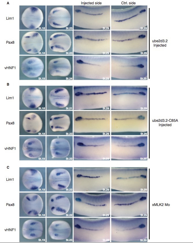 The Jun N-terminal kinase kinase kinase MLK2 is required for the formation of the pronephros during early Xenopus development. Here, we have used a yeast 2-hybrid screen to identify proteins that interact with and regulate xMLK2. Using an N-terminal polypeptide encompassing the SH3 and kinase domains of xMLK2 as bait, five independent cDNAs were identified, all of which encoded a Xenopus ubiquitin conjugating enzyme, ube2d3.2. Ube2d3.2 is a functional E2 enzyme expressed maternally and in a tissue-restricted fashion during development. Ectopic expression of ube2d3.2 inhibits formation of the pronephric tubules, resulting in a phenotype very similar to the loss of xMLK2 function. Because ube2d3.2 is also shown to limit accumulation of xMLK2, it is likely that this effect is direct, although other explanations are possible. Ube2d3.2 is thus probably an endogenous regulator of xMLK2, and hence of JNK activity.
