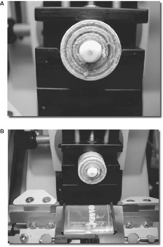 Figure 1. Photographs showing the process of preparing material for real-time PCR tomography. (A) The Xenopus laevis oocyte imbedded in OCT is mounted in a cryostat. (B) The material is sliced for subsequent analysis by real-time RT-PCR.