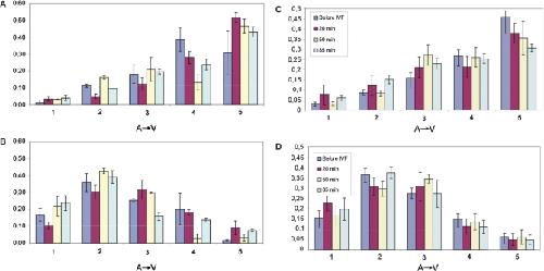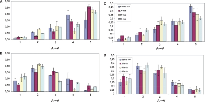 Figure 2. Intracellular gradients (A→V) of mRNA levels in Xenopus laevis oocytes. Distribution of (A) Vg1 and (B) Oct60 expression density along the oocyte animal–vegetal axis. The RNA was prepared from two to three individual eggs (standard error of the means indicated by error bars) from four different females (indicated by regular bars). Effect of fertilization. Distribution of (C) Vg1 and (D) Oct60 along the animal–vegetal axis. RNA was prepared from at least six eggs before IVF and at 20, 50 and 85 min after fertilization. Error bars indicate standard error of the means.