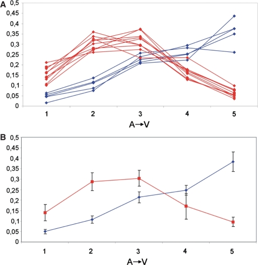 Figure 3. (A) Averaged intracellular mRNA concentration profiles (AâV) for genes studied in at least six eggs. Animal genes (FoxH1, Oct60, GSK-3β, dishevelled, EF-1alpha, Xmam, Tcf-3, GAPDH, β-catenin and XPar-1) are shown in red and vegetal genes (VegT, Vg1, Xdazl, Wnt11 and Otx1) are shown in blue. (B) Average expression profiles of all vegetal (red) and all animal (blue) genes. The error bars indicate 1 SD.