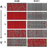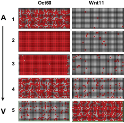 Figure 4. Digital PCR of Wnt11 and Oct60 showing abundance of transcripts in the five oocyte segments (A→V). mRNA from each segment was distributed into 765 chambers that were analyzed by RT-PCR. Red indicates positive PCR for targeted product.