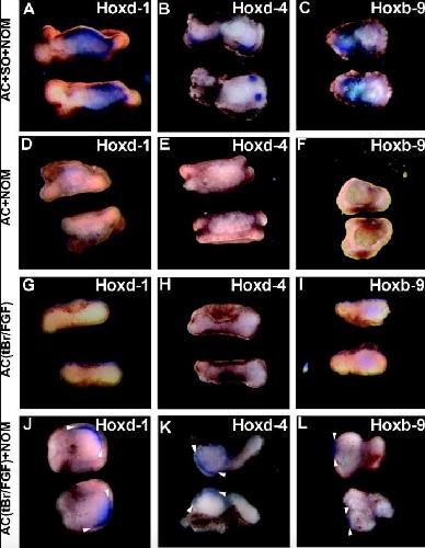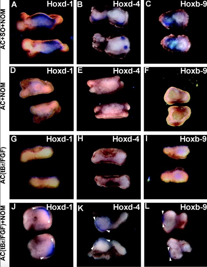 Fig. 4. The Spemann organizer function for AP patterning in wrap assays can be replaced by neural activation. (AâC) Wraps containing both, organizer and non-organizermesoderm (AC + SO + NOM) express Hoxd-1 (A), Hoxd-4 (B) and Hoxb-9 (C) in the ectoderm. (DâF) Wraps containing exclusively non-organizermesoderm (AC + NOM) do not express Hoxd-1, Hoxd-4, or Hoxb-9. The same observation was made for Wraps containing exclusively organizermesoderm (not shown). (GâI) Neural activation by tBr and FGF-4 mRNA in the ectoderm of wraps without mesodermal implants (AC(tBr/FGF)) does not result in expression of Hoxd-1, Hoxd-4, or Hoxb-9. (JâL) tBr and FGF-4 mRNA injection to neurally activate ectoderm of Wraps containing non-organizermesoderm (AC(tBr/FGF) + NOM) replaces the organizer function for induction of the expression of Hoxd-1, Hoxd-4, or Hoxb-9 (arrowheads).