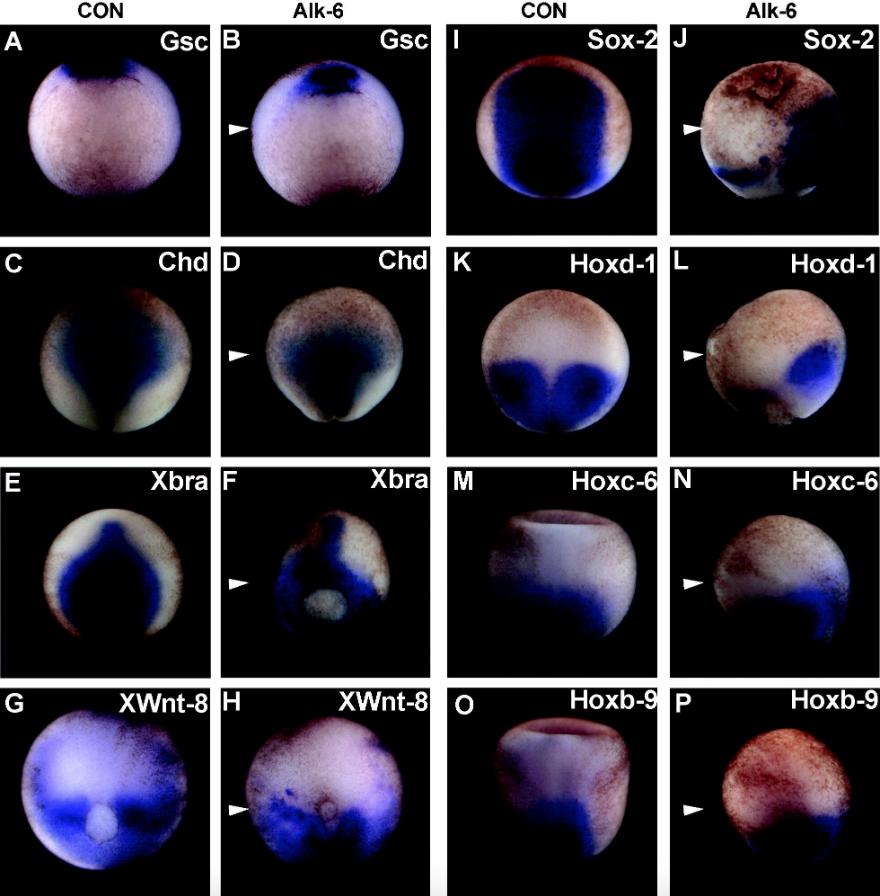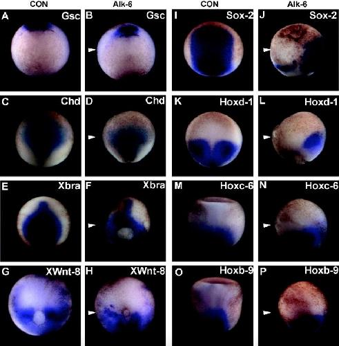 Fig. 6. Inhibition of neural activation in presence of an organizer strongly affects AP pattern formation. The mRNA of the constitutively active BMP receptor hAlk-6 was injected into predominantly ectodermal precursors of the left side (arrowheads) to prevent neural activation on one side of the embryos. (A, B) Presence of the early Gsc expression in a non-injected control embryo (CON) and in a hAlk-6 injected embryo (Alk-6) demonstrates that the formation of an organizer is not disturbed by the injection of hAlk-6. (C, D) Presence of Chd expression in a non-injected control embryo and in a hAlk-6 injected embryo at the end of gastrulation demonstrates the remaining presence of the organizer during gastrulation. (E, F) Expression of the mesodermal marker Xbra in the organizertissue of the presumptive notochord again shows the presence of the organizer both, in a non-injected control and in a hAlk-6 injected embryo. (G, H) The posterior marker Xwnt-8 remains in its domain on the injected side, indicating that hAlk-6 expression does not prevent formation of posterior tissues. This is in accordance with the minorly affected posteriorXbra expression around the blastopore (E, F). (I, J) The neural marker Sox-2 is expressed in the whole neural plate of control embryos, but it is drastically reduced after hAlk-6 injection, indicating the inhibition of neural activation on the injected side. (G, H) Expression of Hoxd-1. (I, J) Expression of Hoxc-6. (K, L) Expression of Hoxb-9. The expression of all three Hox genes is reduced on the left side, where neural activation is inhibited by hAlk-6 injection.