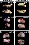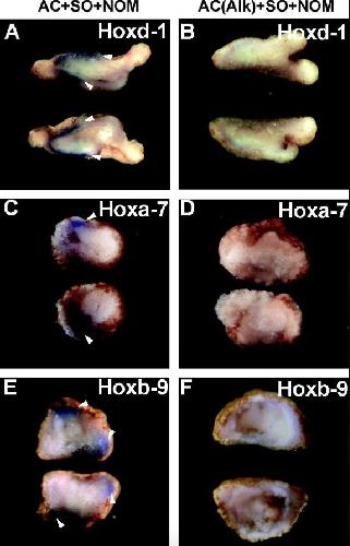 Fig. 7. Inhibition of neural activation by ectodermal expression of the constitutive active BMP receptor hAlk-6 in wrap assays affects the ectodermal AP patterning. (A) Expression of Hoxd-1 (arrowheads) in wraps containing both, organizer and non-organizermesoderm surrounded by non-injected ectoderm (AC + SO + NOM). (B) Inhibition of neural activation by injection of hAlk-6 in the ectoderm of such wraps (AC(Alk) + SO + NOM) results in the repression of Hoxd-1 expression. (C) Expression of Hoxc-6 (arrowheads) in wraps containing organizer and non-organizermesoderm surrounded by non-injected ectoderm. (D) Inhibition of neural activation in the ectoderm of such wraps results in repression of Hoxc-6 expression. (E) Expression of Hoxb-9 (arrowheads) in wraps containing organizer and non-organizermesoderm surrounded by non-injected ectoderm. (F) Inhibition of neural activation in the ectoderm of such wraps results in the repression of Hoxb-9 expression.