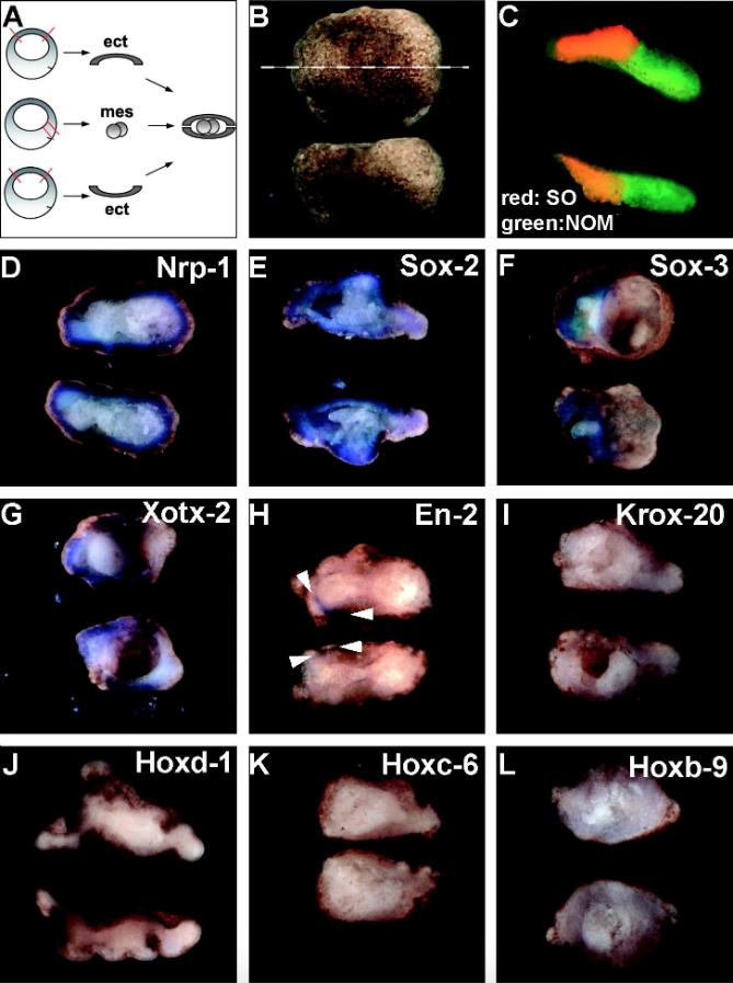 Fig. 1. The Spemann organizer induces a rudimentary AP pattern in wrap assays. (A) In the wrap assay small mesodermal explants (mes, e.g. organizer or non-organizermesoderm) are wrapped into ectodermal animal caps (ect) to analyze inductive events. (B) A wrap in topview and lateral view. For the analysis Wraps are bisected after in situ hybridization across the implants (dashed line). (C) Both halves of a bisected Wrap. Vital staining of two mesodermal implants (red; organizermesoderm (SO), green; non-organizermesoderm (NOM)) in unlabeled ectoderm show that the tissues do not intermingle. (DâF) The general neural markers Nrp-1, Sox-2, and Sox-3 are activated in Wraps containing exclusively organizer implants. (G) The forebrain marker Xotx-2 is induced in the ectoderm of wraps by an organizer implant. (H) En-2, a marker for the midbrainâhindbrain boundary, is weakly induced (arrowheads) by the organizer. I Krox-20, which is normally expressed in the rhombomeres 3 and 5 of the hindbrain, is not activated by the organizer. (JâL) The Hox genes Hoxd-1, Hoxc-6, and Hoxb-9, which label different positions along the AP axis are not induced in Wraps containing exclusively organizermesoderm.