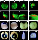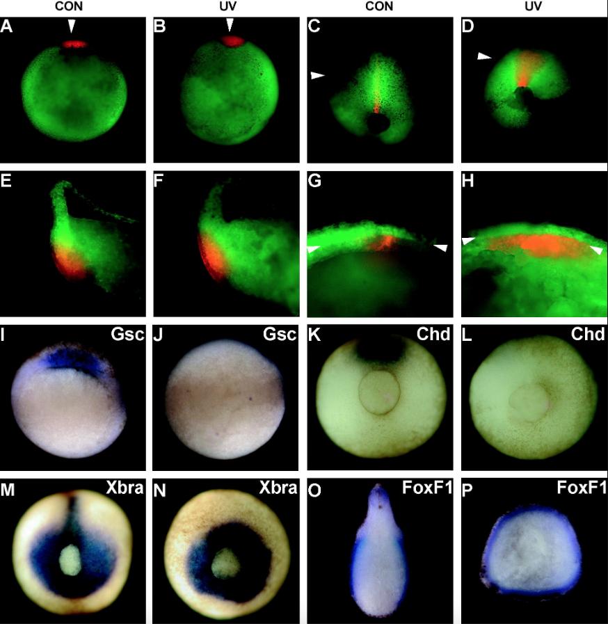 Fig. 2. UV treatment results in embryos without an organizer. Embryos were injected with EosFP. The EosFP in a small region of the marginal zone was converted at the beginning of gastrulation. (A) An untreated control embryo (CON) with a conversion in the organizer region. (B) An UV-treated embryo (UV) with a corresponding conversion of the marginal zone. (C) Shape of the conversion at late gastrulation in an untreated control embryo. (D) Shape of the conversion at late gastrulation in an UV-treated embryo. (E) Bisection of the control embryo shown in (A). (F) Bisection of the UV-treated embryo shown in (B). (G) Bisection of the control embryo shown in (C). Arrowheads indicate Brachetâs cleft between not involuted and involuted tissue. (H) Bisection of the control embryo shown in (D). Arrowheads indicate Brachetâs cleft. The arrowheads in (AâD) indicate the plane of bisection. Comparison of gene expression in control embryos and UV-treated embryos. (I, J) The expression of the organizer gene Goosecoid (Gsc) at early gastrulation in an untreated control (I) and in an UV-treated embryo (J). (K, L) The expression of the organizer gene Chordin (Chd) at mid to late gastrulation in an untreated control (K) and in an UV-treated embryo (L). (M) The mesodermal marker Brachyury (Xbra) is expressed around the blastopore and in the forming notochord. (N) In UV-treated embryos the Xbra expression around the blastopore is found, the notochordal expression is absent. (O) A cross section of an untreated control embryo labeled for lateral plate mesoderm with FoxF1 (stage 26). (P) A cross section of an UV-treated embryo labeled for the lateral plate mesoderm with FoxF1 (stage 26).