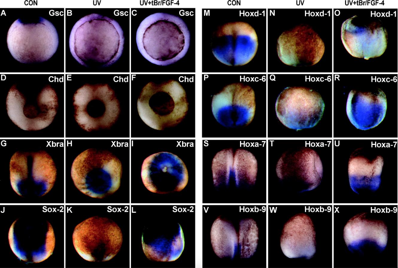 Fig. 3. Restoration of neural activation by injection of tBr and FGF-4 in predominantly ectodermal precursors of UV-treated embryos results in AP patterning of embryos without Spemann organizer. The first column shows expression of different markers in untreated control embryos (CON). The second column shows expression of these markers in UV-treated embryos (UV). The third column shows expression of these markers in UV-treated embryos, which were animally injected with mRNAs for tBr and FGF-4 (UV + tBr/FGF-4). (AâC) Vegetal view of early gastrula embryos stained for the organizer gene Goosecoid (Gsc). In UV-treated embryos gsc is not expressed. Its expression is not restored by the animal injection of tBr and FGF-4, indicating the remaining absence of an organizer. (DâF) Vegetal view of stage 11.5 embryos stained for Chordin (Chd), which normally is expressed in the organizer and the overlying neural floor plate. In UV-treated embryos it is absent and not restored after tBr and FGF-4 mRNA injection into the animal pole, indicating the remaining absence of the organizer. (GâI) Expression of the mesodermal marker Brachyury (Xbra) at stage 12.5 in the marginal zone around the blastopore and in the prospective notochord (arrowhead). The notochordal expression is absent in UV-treated embryos and not restored after injection of tBr and FGF-4 mRNAs, again indicating the absence of the organizer. The non-organizer expression around the blastopore remains. (JâL) Sox-2 expression demarcates the neural plate in control embryos, and indicates the absence of neurectoderm in UV-treated embryos (stage 15). After injection of tBr and FGF-4 into the animal region of UV-treated embryos, almost all ectoderm shows Sox-2 expression. (MâO) Hoxd-1, which is expressed up to the level of the posterior portion of hindbrain, is absent in UV-treated embryos, but is mildly restored after injection of tBr and FGF-4 mRNAs in ectodermal precursors of UV-treated embryos (stage 15). (PâR) Hoxc-6, which is expressed along the spinal cord, is depleted in UV-treated embryos. Expression is restored after injection of tBr and FGF-4 mRNA in the animal blastomeres of UV-treated embryos (stage 15). (SâU) Hoxa-7 expression along the spinal cord of control embryos (stage 18) is depleted in UV-treated embryos, but is restored after injection of tBr and FGF-4 mRNA in animal blastomeres of UV-treated embryos. (VâX) Hoxb-9 expression along the posterior spinal cord of control embryos (stage 18) is depleted in UV-treated embryos, but is restored after injection of tBr and FGF-4 mRNA in animal blastomeres of UV-treated embryos.