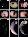 Fig. 5. Ectopic areas of neural activation after injection of tBr and FGF-4 in a ventral animal blastomere at 32-cell stage show AP patterning gene expression independent of the organizer. (A, G) Lineage tracing with GFP (arrowheads) after coinjection of the mRNAs of tBr, FGF-4, and EGFP. (A) Ventrolateral view at stage 18. The head is to the left. (B) The embryo from (A) after in situ hybridization for the neural marker Sox-2 shows ectopic ventrolateral Sox-2 expression (arrowhead). (C) Ectopic expression of tBr and FGF-4 results in an ectopic Hoxd-1 domain at stage 18 (arrowhead). (D) Ectopic expression of tBr and FGF-4 results in an ectopic Hoxd-4 domain at stage 18 (arrowhead). (E) Ectopic expression of tBr and FGF-4 results in an ectopic Hoxc-6 domain at stage 18 (arrowhead). (F) Ectopic expression of tBr and FGF-4 results in an ectopic Hoxb-9 domain at stage 18 (arrowhead). (G) A lateral view at stage 28. The head is up and ventral to the left. The arrowhead indicates the GFP domain. (H) Lateral view of a normal embryo at stage 30 showing Hoxd-4 expression. (I) Lateral view of an injected embryo at stage 30 showing an ectopic ventral patch of Hoxd-4 expression (arrowhead).