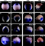Supplementary Figure. Marker analysis of UV-treated embryos. A The marker Sox-2 demarkates the neural plate in untreated control embryos (CON) at stage 17 B Sox-2 is absent in UV treated embryos (UV). C The marker Xsna demarcates the neural crest of non-treated control embryos (arrowheads). D In UV treated embryos Xsna is not expressed indicating the absence of neural crest. E The epidermal marker XK81A1 is expressed in non-neural ectoderm of non-treated control embryos. F In UV treated embryos XK81A1 is expressed in all ectodermal cells indicating the absence of the neural plate. G Cross sections show that brevican (Xbcan) is expressed in the notochord (arrowhead) of non-treated control embryos at stage 26, which originates from the organizer. H In cross sections of UV treated embryos of an identical stage no Xbcan is found. I The somitic mesoderm marker MyoD is expressed in the forming somites on both sides of the dorsal midline in non-treated control embryos at stage 12.5. J In UV treated embryos the MyoD expression is reduced to a small domain around the blastopore. K Cross sections of non-treated control embryos at stage 26 show Xwnt-8 expression (arrowheads) in the intermediate mesoderm. L In cross sections of UV treated embryos Xwnt-8 (arrowheads) is expressed as a stripe around the blastopore indicating that there is still intermediate mesoderm. M, N Xotx-2 expression in the headmesoderm and the anterior portion of the neural plate is downregulated in UV treated embryos indicating the absence of organizer derived headmesoderm and of neural activation. O In non-treated control embryos (stage 20, anterior view) En-2 expression demarcates the mid-/hindbrain boundary. P In UV treated embryos the En-2 expression is absent. Q Hoxd-4 is expressed along the spinal cord in non-treated control embryos (stage 20, anterior view). R In UV treated embryos Hoxd-4 expression was not detected.
