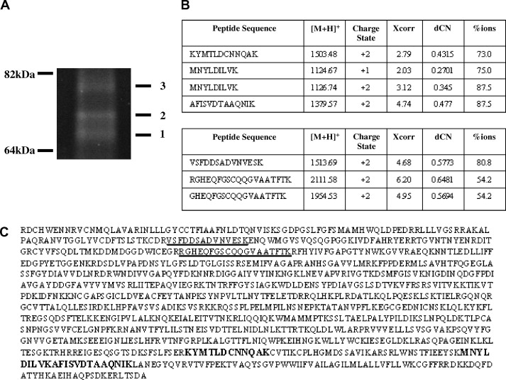 Verification of the presence of α6p and a6N in Xenopus by tandem mass spectrometry coupled to liquid chromatography (LC–MS/MS). (A) Isolation of the fragments of the cleaved α6 integrin by immunoprecipitation. (B) Band #2 produced a total of 4 high-scoring peptides covering 3.1% (bold) of the primary sequence of integrin α6 (C), whereas band #3 produced a total of three high-scoring peptides covering 3.0% (underlined) of the primary sequence of integrin α6 (C).