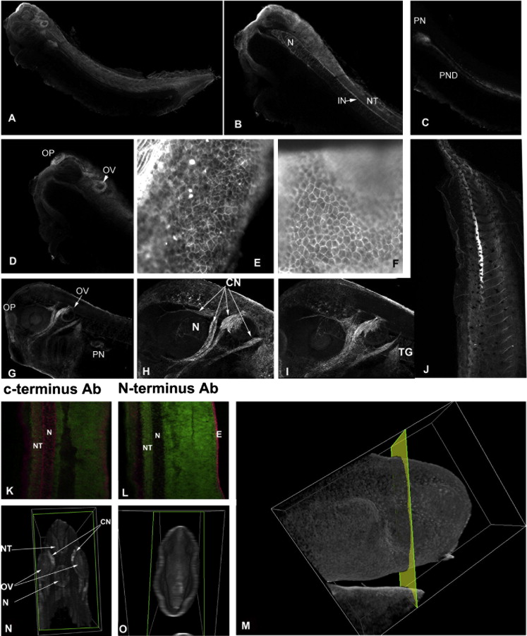 Integrin α6 and α6p expression and localization in Xenopus embryos. Whole mount immunostaining of a Xenopus embryo (stages 33 and 34) using a polyclonal anti-α6 antibody against the C-terminus of α6A (A). Panel A shows a 2D projection of a series of optical sections from a cleared embryo. BâD are individual optical sections where the principal expression domains are shown more clearly. Panels E and F show the expression of actin and α6, respectively, in the Xenopus tadpoleepidermis. The α6 protein is found throughout the CNS and the notochord (N) with higher expression in the neural tube (NT), the olfactory placode (OP), interneurons (IN), the pronephros (PN), and the pronephric duct (PND). (GâI) Both antibodies tested also gave strong signal at a subset of cranial nerves (CN) and the trigerminal gaglia (TG) as seen in panels H and I. At late tadpole stages (stage 42) α6 is expressed in the vascular system with prominence in the newly formed vessels (J). (K and L) Full length α6 is only found in the epidermis and is completely absent from the notochord and other internal tissues. Optical sections of embryos stained with a C-terminal α6 antibody (K) and an N-terminal antibody (L). (N and O) 3D reconstruction of embryos, which were optically sectioned as indicated in M (tissues on the left side of the plane shown were removed leaving only the anterior structures) reveals that α6 is only found in the epidermis of stage 35 embryos with α6p present in the notochord (N), the neural tube (NT), the otic vesicle (OV) and cranial nerves (CN).