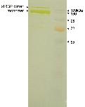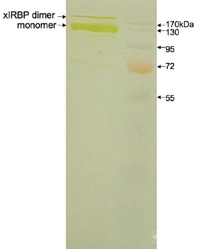 Figure 1. Gel electrophoresis (SDS–PAGE; silver stained) analysis of the purified four-module containing Xenopus interphotoreceptor retinol-binding protein. The major band corresponds to monomeric Xenopus interphotoreceptor retinol-binding protein (xIRBP) molecular weight of 131 kDa. The minor higher molecular weight band represents dimeric form of the protein, which may or may not be an artifact of the analysis itself.