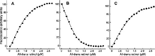 Figure 2. Fluorescence titrations are shown of Xenopus interphotoreceptor retinol-binding protein (xIRBP) binding all-trans retinol. The concentration of xIRBP was 0.89 μM in each panel. A: The titration of IRBP with all-trans retinol in this panel is followed by monitoring the increase in retinol fluorescence compared to a fluorescence matched solution of N-acetyl-L-tryptophanamide (excitation: 330 nm; emission: 480 nm). B: The titration shown follows the quenching of intrinsic protein fluorescence by bound retinol (excitation: 280 nm; emission: 340 nm). C: The titration follows ligand binding by monitoring energy transfer (excitation: 280 nm; emission: 480 nm).