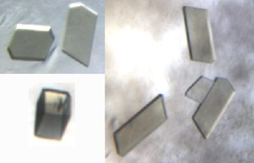 Figure 3. Photomicrographs of Xenopus interphotoreceptor retinol-binding protein crystals grown in the presence of oleic acid. The crystals were typically about 0.2 mm in the longest dimension.
