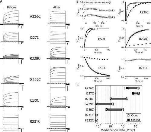 Figure 2. S4 cysteine substitutions in KCNQ1 show state-dependent MTSET modification. (A) TEVC recordings of representative Q1 channels with cysteine substitutions in S4 expressed in Xenopus oocytes before and after MTSET modification. Oocytes were held at −80 mV, and currents were elicited from 4-s command voltages from −100 mV to +40 mV in 20-mV increments. Scale bars represent 0.5 μA and 0.5 s. Dashed line indicates zero current. (B) Change in current monitored over time using 40-mV test pulses with continuous perfusion of MTSET. For negative controls, 800 μM MTSET was used for Q1 and Q1/E3; 1600 μM for Q1/E1 and the data were plotted on the same y-axis scale as the cysteine mutants and are separated by line hatches. Open circles represent the “open” protocol where channels were depolarized for 11% of total time; filled squares: “closed” protocol, 0.6% of total time. Currents from the open and closed protocols were measured ∼5 ms before the end of the shortest depolarizing pulse and were normalized to the maximal change in current for comparison. Curves were fit to single or double exponentials to calculate reaction rate constants (Table I). (C) Comparison of MTSET modification rates for Q1 S4 cysteine substitutions in the open (open circles) or closed (filled squares) protocols. The gray bar gives the fold-change in rate between the open and closed protocols. X-out open circles indicate no observed change of current using open protocol; X-out squares are an estimate of reaction rate in the closed protocol based on the extent of modification determined by switching to the open protocol. Data were averaged from three to six oocytes ± SEM.