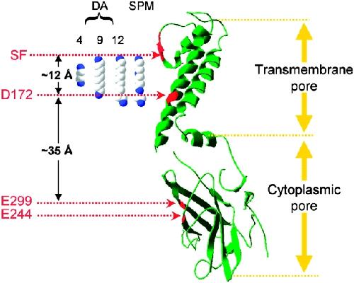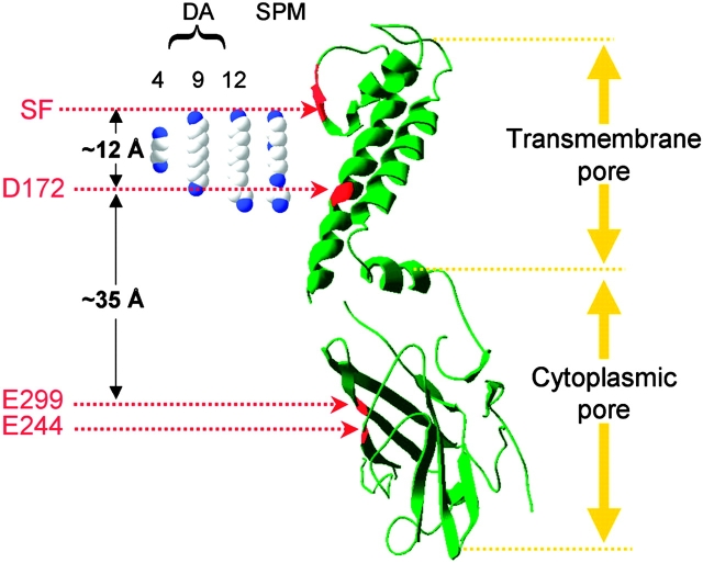 Figure 1. . Model of inward rectification. Structural model of the closed KirBac1.1 channel, outlining the transmembrane and cytoplasmic pore regions. For comparison with channel pore dimensions, DA4, DA9, DA12, and spermine (SPM) are shown from left to right as space filling molecules. Relative distances (in angstroms) between the selectivity filter (SF), D172, and E224/E229 in Kir2.1 are assumed to be the same as between the corresponding positions in KirBac1.1.