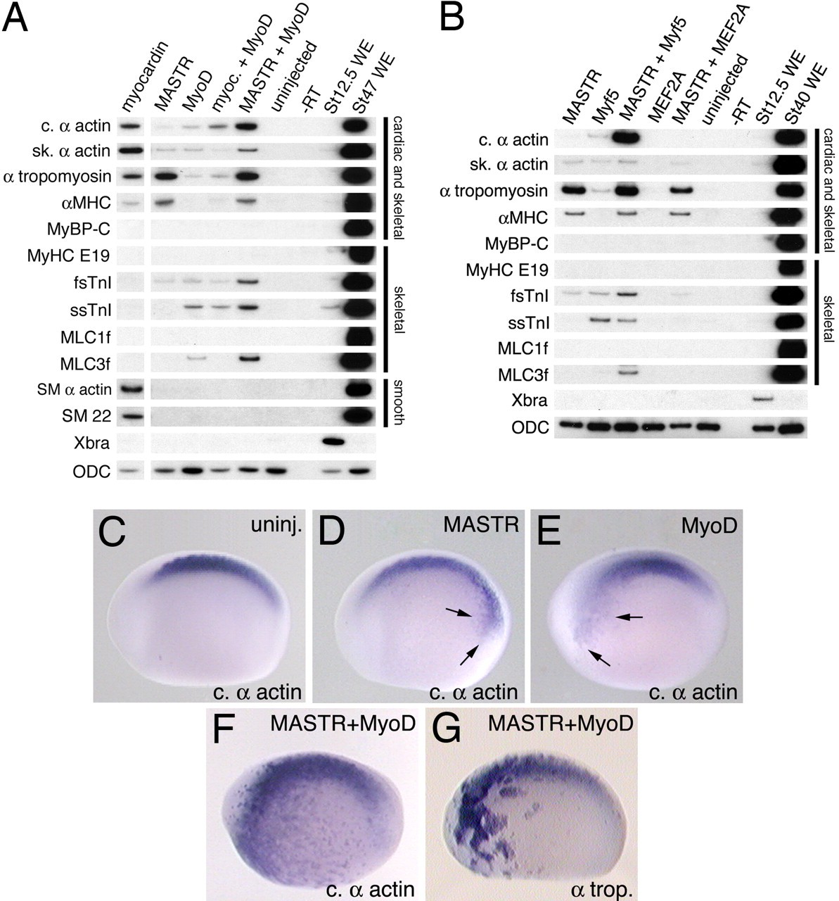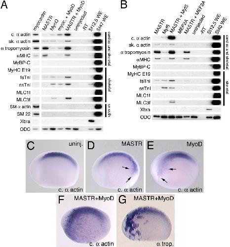 coope Fig. 4. MASTR rates with MyoD or Myf5 to activate expression of muscle markers. Embryos were injected with mRNA encoding either myocardin or MASTR alone or together with mRNA encoding MyoD or Myf5. Animal cap explants were harvested at St 12.5 for RT-PCR analysis. Muscle markers are indicated on the left-hand side of the figure. Muscle tissues expressing the various markers are indicated at the right. ODC served as a loading control. (A) Coexpression of MASTR and MyoD results in increased transcription of muscle markers over either factor alone. This is particularly evident for cardiac α-actin, fsTnI, and MLC3f. Coexpression of myocardin with MyoD does not result in an equivalent activation of marker expression. (B) Coexpression of MASTR with Myf5 also activates transcription of muscle markers. Methods are identical to those described in A. No cooperation is observed between MASTR and the MADS factor, MEF2A. (CâG) Embryos were injected with mRNA encoding MASTR or MyoD alone or in combination and then assayed at St 22/23 for expression of muscle markers. Control (C), MASTR mRNA-injected, 100 pg (D), MyoD mRNA-injected, 100 pg (E), and MASTR plus MyoD mRNA-injected (F) embryos (100 pg of each) assayed for cardiac α-actin expression. Minor activation of cardiac α-actin expression is indicated by arrows in D and E. As shown in F, coexpression of MASTR and MyoD resulted in high levels of ectopic expression of cardiac α-actin D. (G) Coexpression of MASTR and MyoD results in high levels of ectopic expression of α-tropomyosin. Quantitation of the results of whole-embryo coexpression studies is presented in SI Table 3.