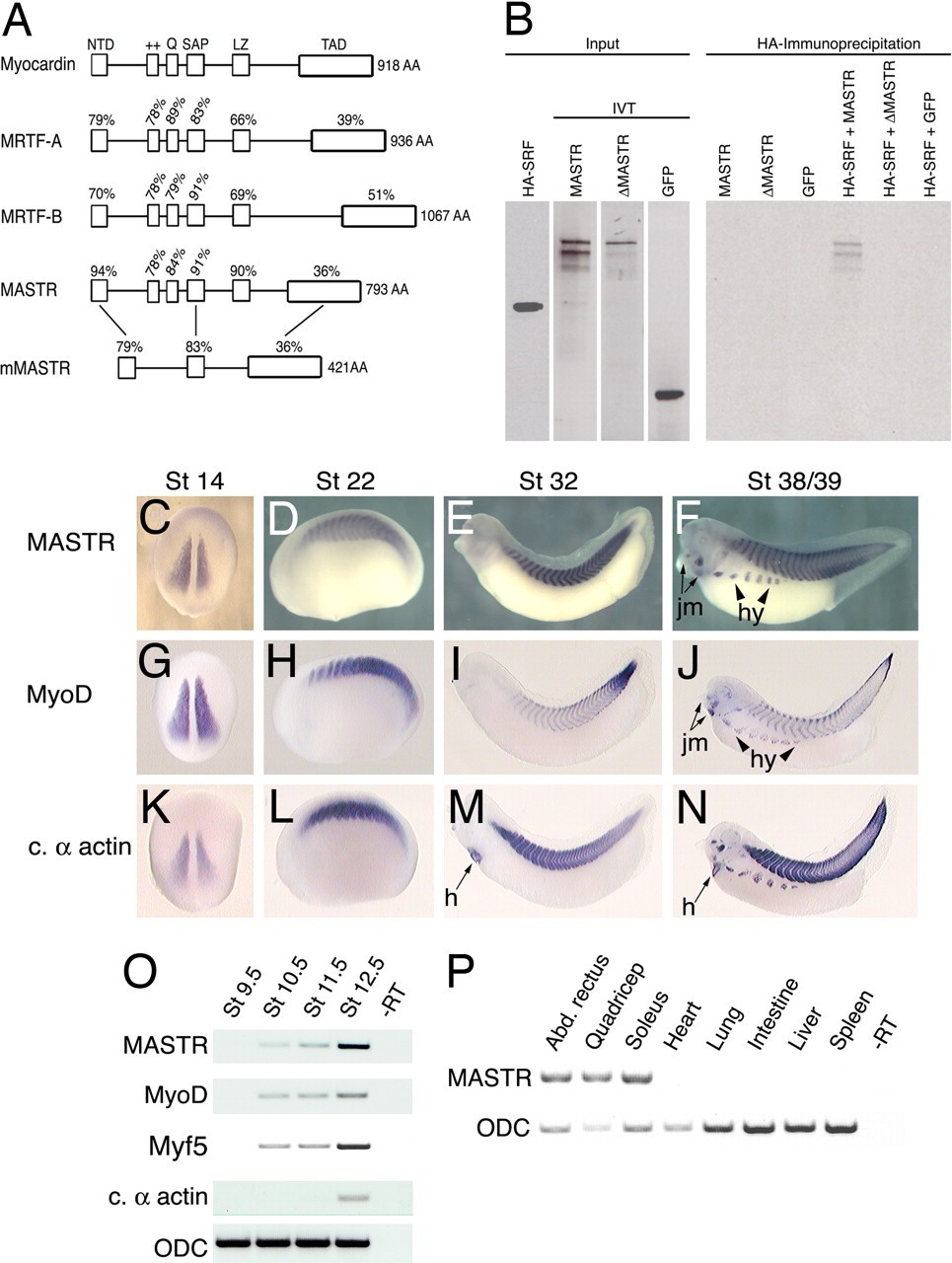Fig. 1. MASTR is a previously uncharacterized member of the myocardin-related family of proteins. (A) Alignment illustrating the domains of the four known Xenopus myocardin family proteins and also mouse MASTR. Percentages indicate identity within each domain relative to myocardin or between Xenopus and mouse MASTR. (B) Co-IP experiments demonstrate that MASTR forms a physical complex with SRF. HA-tagged SRF and radiolabeled in vitro-translated MASTR, δMASTR, and EGFP are shown (Left). Only full-length MASTR protein coprecipitated with SRF (Right). (CâF). In situ hybridization analysis of MASTR expression during Xenopus development. MASTR transcripts are detected specifically in skeletal muscle tissues at all stages. Expression in hypaxial muscle (hy) and jaw muscle (jm) is indicated. (GâJ) Transcriptional expression of MyoD. Intensity of MyoD expression differs from MASTR, but the location of transcripts is identical. (KâN) Expression of the striated muscle marker, cardiac α-actin. In addition to marking all tissues expressing MASTR, cardiac α-actin is expressed in the heart (h). (O) RT-PCR analysis showing MASTR expression is first detected in the gastrula (St 10.5) coincident with the appearance of MyoD and Myf5 mRNA. The muscle differentiation marker cardiac α-actin is not detected until St 12.5. Ornithine decarboxylase (ODC) was used as a loading control. (P) RT-PCR analysis of MASTR transcripts in adult frog tissues. MASTR is expressed in representative skeletal muscles (abdominal rectus, quadriceps, and soleus) but not in heart, smooth muscle (intestine), or other tissues.