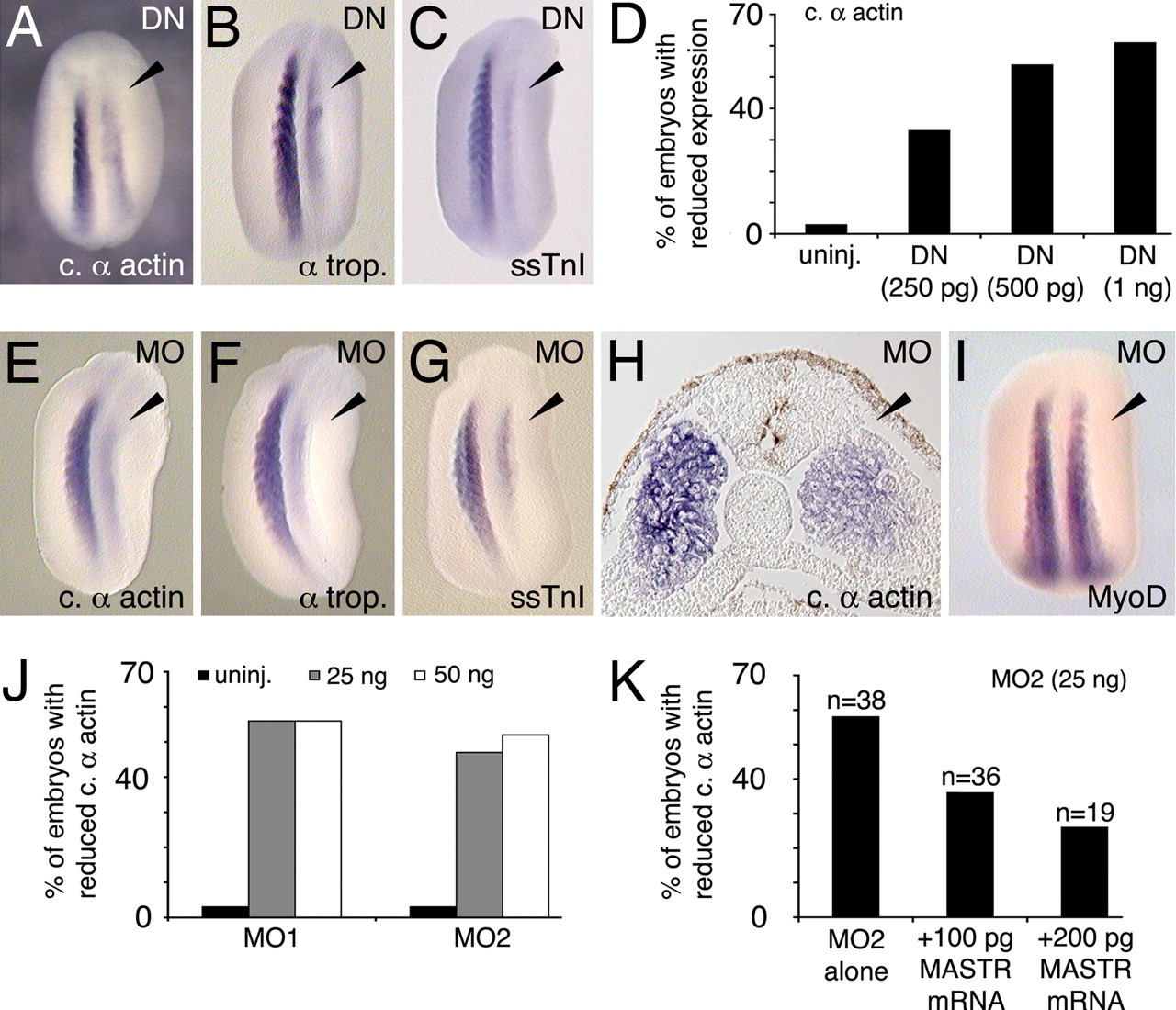 Fig. 2. Inhibition of MASTR function reduces expression of skeletal muscle markers. (AâC) Embryos expressing a dominant-negative form of the MASTR protein (DN-MASTR) were assayed at St 22/23 for muscle markers as shown. Injected sides are indicated by arrowheads. (D) Dose-dependent reduction in cardiac α-actin expression after expression of DN-MASTR. (EâG) MO knockdown of MASTR expression results in reduced muscle marker expression as indicated. MO-treated sides are indicated by the arrowheads. (H) Transverse section through the trunk of St 22 embryo treated with MO on the right-hand side and assayed for cardiac α-actin expression. The general structure of the somite is normal, but marker expression is reduced on the treated side. (I) MO-treated embryo shows no reduction in MyoD expression. (J) Two nonoverlapping MO sequences directed against MASTR mRNA (MO1 and MO2) were equally effective in reducing expression of cardiac α-actin. (K) Rescue of the MO-induced phenotype. Embryos were injected with MO2 alone or with MO2 plus MASTR mRNA. Addition of MASTR mRNA achieved partial rescue of MO inhibition in a dose-dependent manner.