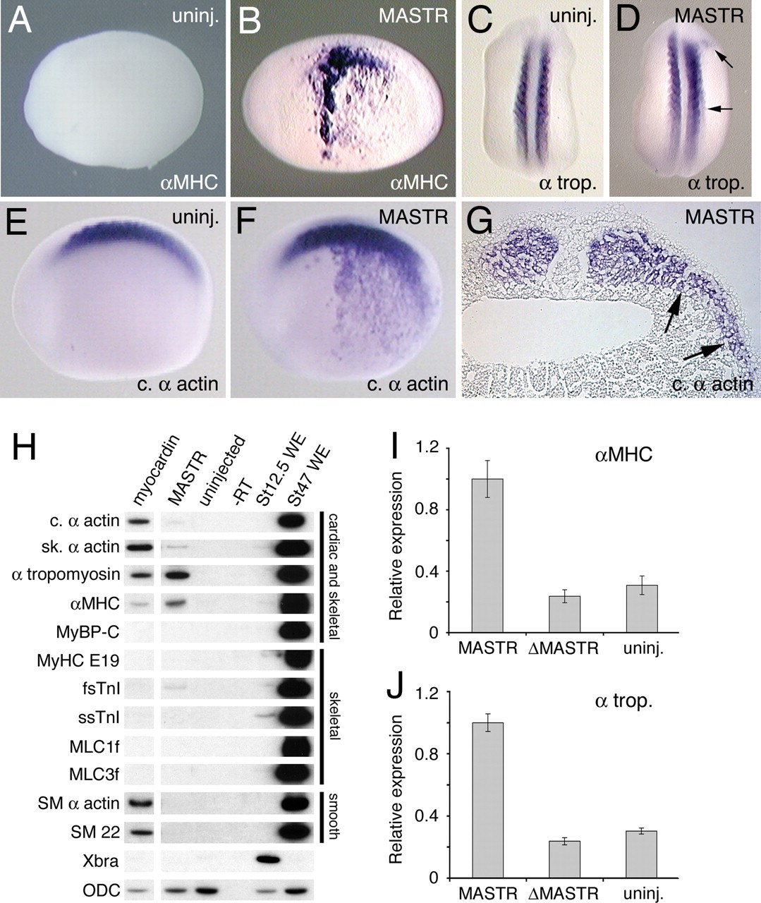 Fig. 3. MASTR induces ectopic expression of muscle markers. (A) Uninjected control embryo at St 22 (lateral view) shows no expression of αMHC marker. (B) Embryo injected with 500 pg of MASTR mRNA shows extensive ectopic expression of αMHC. (C) Control embryo (dorsal view) showing expression of the muscle marker, α-tropomyosin in the somites. (D) Embryo injected with 500 pg of MASTR mRNA shows limited ectopic expression of α-tropomyosin immediately lateral to the somites (arrows). (E and F) Uninjected control embryo (E) and embryo injected with 500 pg of MASTR mRNA (F) assayed for expression of cardiac α-actin. Injected embryo shows extensive ectopic expression of cardiac α-actin. (G) Transverse section through trunk of St 22 embryo injected with MASTR mRNA and assayed for cardiac α-actin transcripts. Arrows indicate that ectopic marker expression is limited to the lateralmesodermtissue and is absent from epidermis and endodermal tissue. (H) MASTR activates expression of muscle markers in nonmuscle (animal cap) tissue. Embryos were injected with 500 pg of mRNA encoding either myocardin or MASTR, and animal cap explants were isolated and then analyzed by RT-PCR at St 12.5. Myocardin serves as a positive control. Muscle markers are indicated on the left-hand side of the figure. Muscle tissues expressing the various markers are indicated at the right. Lanes labeled St 12.5 WE and St 47 WE are positive control samples from whole embryos at St 12.5 and 47 respectively. ODC transcripts serve as a loading control. (I and J) Mutant MASTR lacking SRF interaction domains (δMASTR) fails to activate muscle marker expression. Experiments were conducted exactly as described for H above but analyzed by quantitative PCR. In the case of both αMHC and α-tropomyosin, a low level of transcript is detected in the untreated animal cap. Results are expressed relative to marker transcripts induced by MASTR.