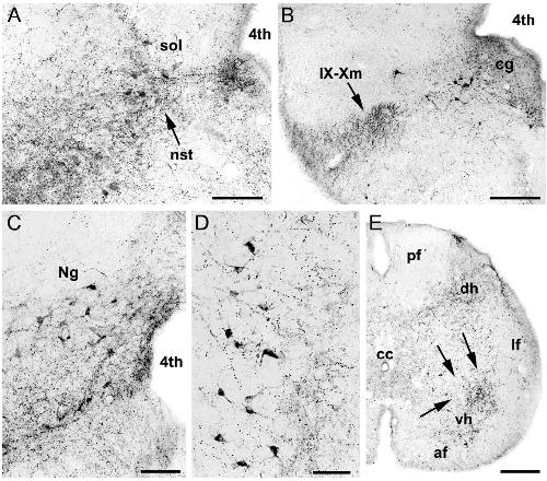 spinal cord. A: Neurons in the nucleus of the solitary tract (nst,