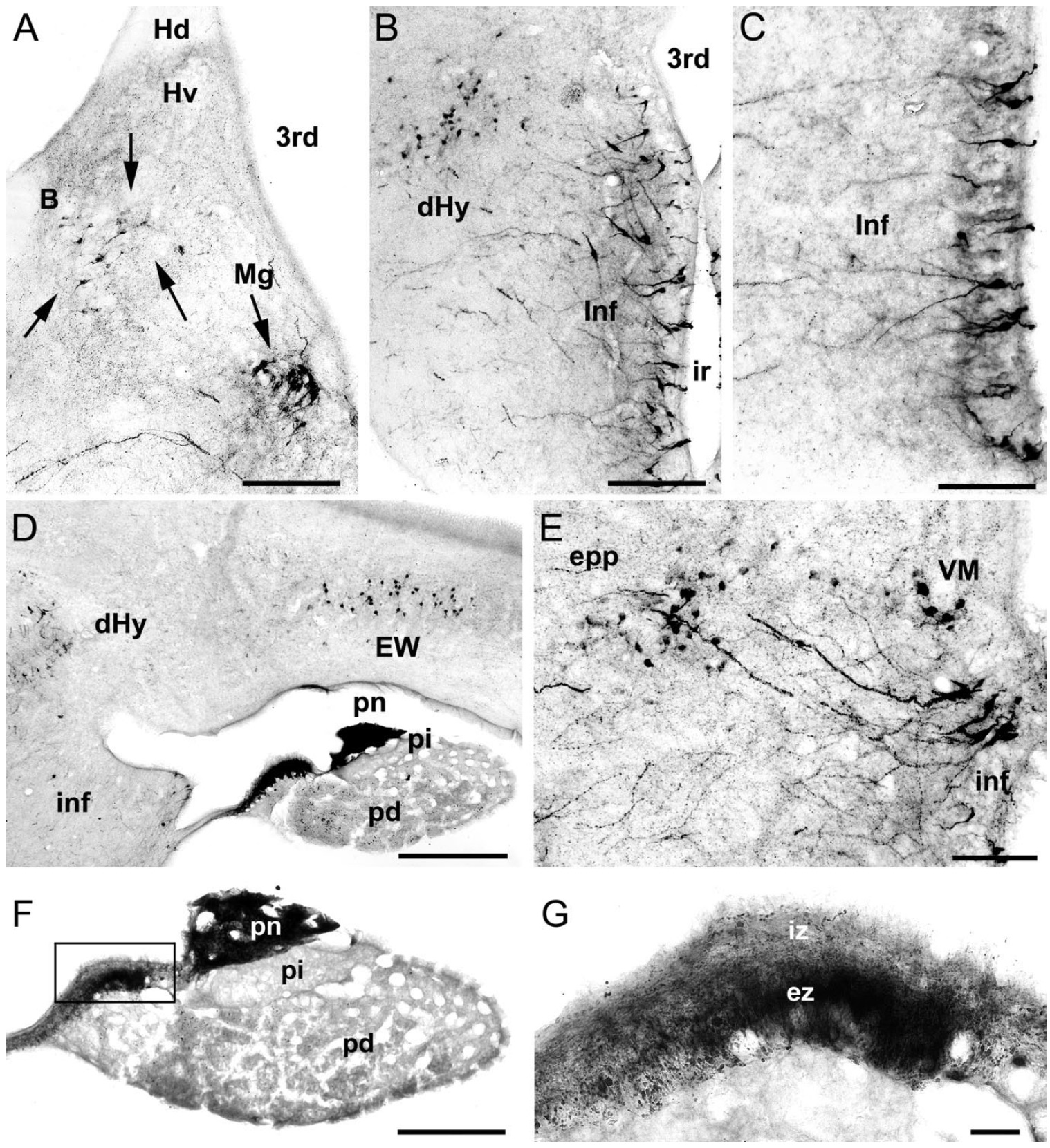 F: Immunostained fibers in the pars nervosa (pn) of the pituitary