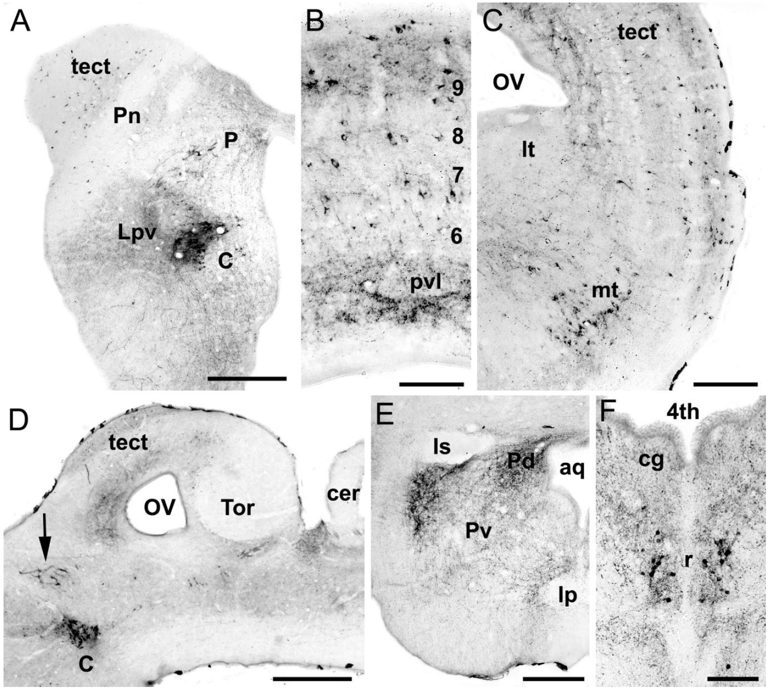 (pvl). C: Immunostained fibers and cells in the optic tectum (tect) and