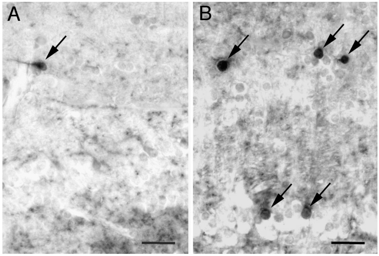 Note stained cells in the nucleus of Bellonci (B; arrows). B: Immunoreactive
