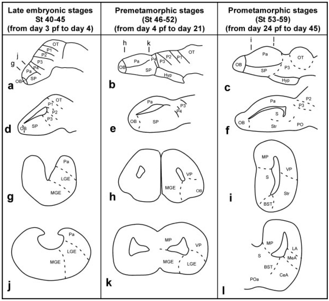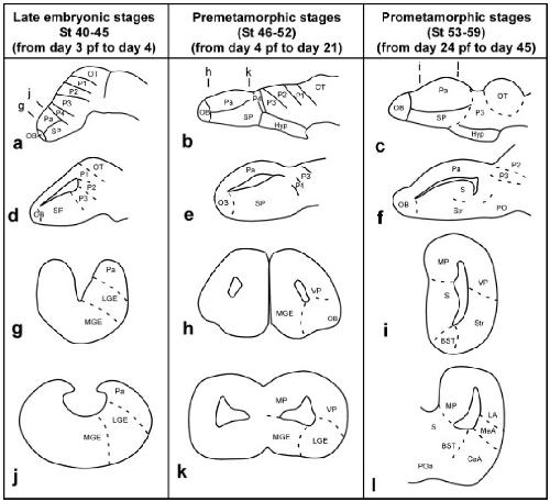 brains illustrating the morphology at different developing stages (late embryonic, premetamorphic,