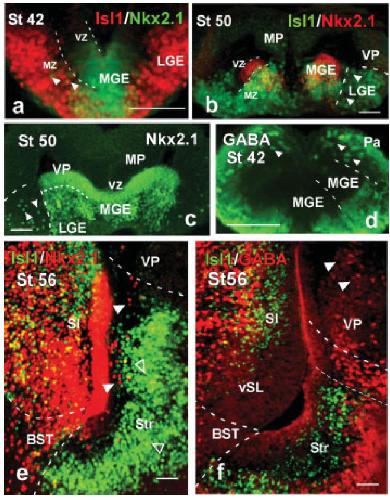 for Isl1 (green) and GABA or Nkx2.1 (red). The